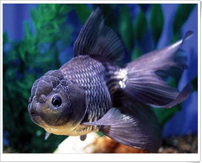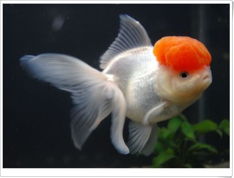 달걀모양과 흡사한 외형으로 몸길이만큼 크고 넓은 배를 가지고 있습니다. 독특한 지느러미를 가지고 있으며, 등지느러미를 제외한 모든 지느러미는 쌍으로 이루어졌습니다. 유영 실력이 좋지 않지만 한쌍의 지느러미를 이용해 물속의 움직임을 컨트롤합니다. 특히 꼬리지느러미는 가장 눈에 띄며, 쌍으로 이루어져 있으며 유영하지 않을 때 펼쳐지는 모습이 아름답습니다. 가장 뚜렷한 특징으로 머리에 있는 모자, 왕관이라도 불리는 사마귀와 겉은 모양의 모자는 나이가 먹을수록 발달합니다. 금붕어 머리 위에 자리 잡혀, 머리를 지나 얼굴을 덮을 정도로 계속 자랄 수 있습니다.